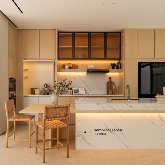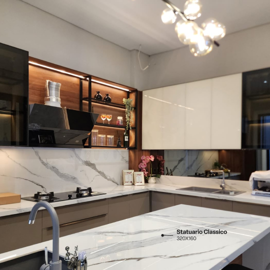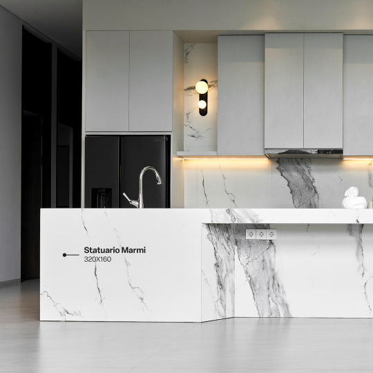 Untuk menciptakan tampilan bersih, terang, dan luas, Anda dapat menggunakan motif QUADRA Statuario Marmi sebagai pelapis backsplash atau top table kitchen set minimalis modern Anda.