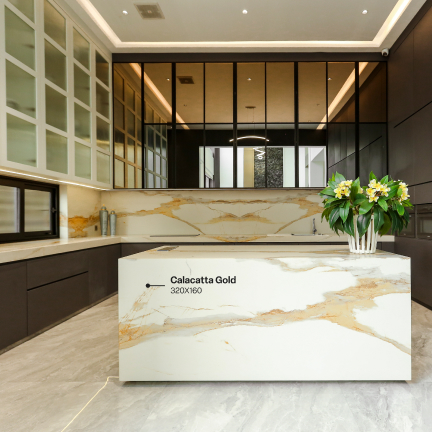 Motif Calacatta Gold QUADRA sebagai pelapis island table dapat menjadi solusi tepat untuk menciptakan kitchen set minimalis modern di dapur Anda.