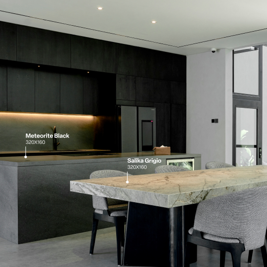 Anda dapat menggunakan motif QUADRA Salika Grigio sebagai pelapis top table dan backsplash untuk mewujudkan open space kitchen set impian Anda.