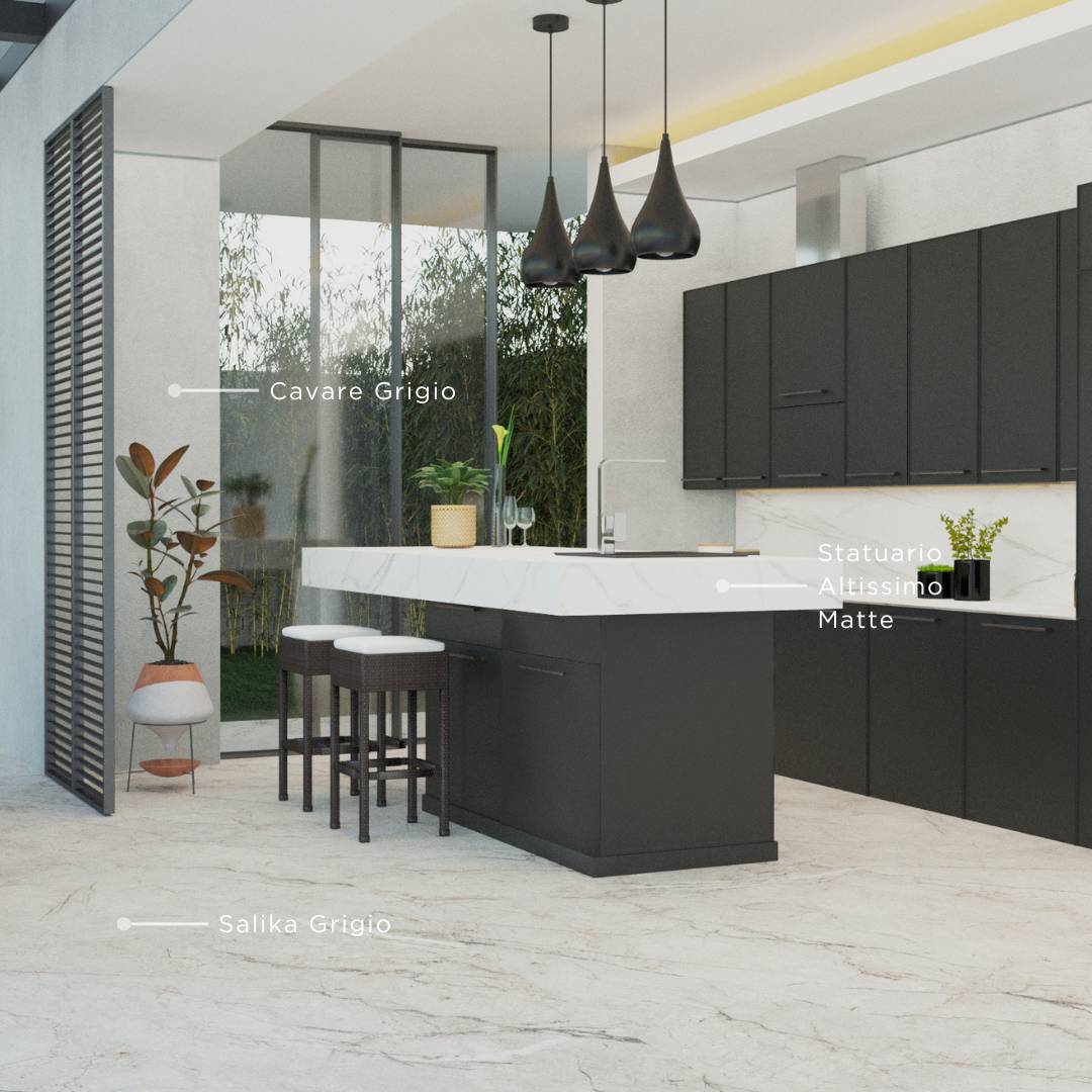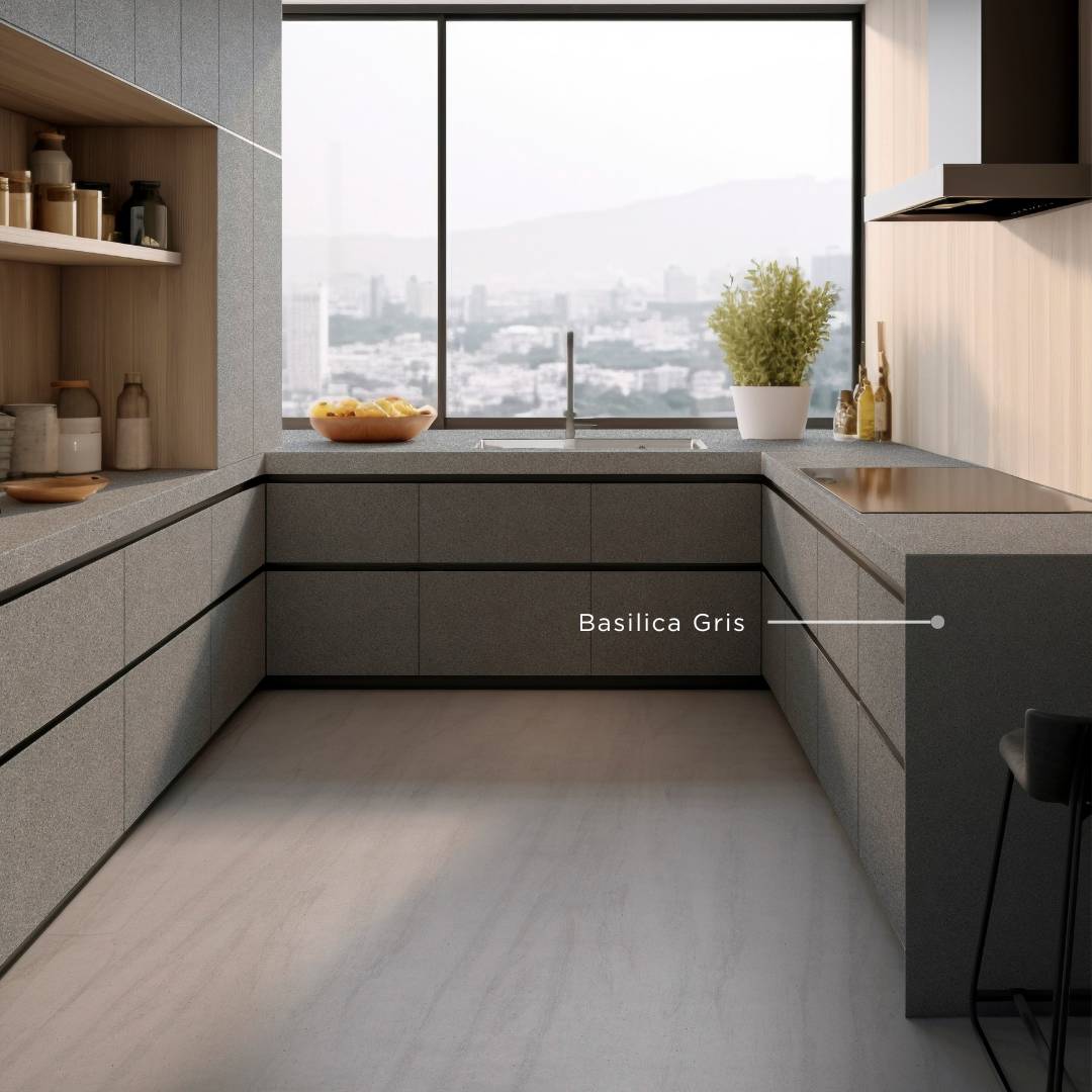 Untuk memberikan kesan industrial yang lebih autentik, pilih dominan finishing matte untuk berbagai elemen dalam desain dapur gaya industrial minimalis Anda. Finishing matte memberikan tampilan yang tidak mengkilap, sehingga lebih menonjolkan kesan industrial yang simpel dan raw. Finishing ini dapat Anda temukan pada QUADRA Basilica Gris yang dapat diterapkan pada kabinet, meja, hingga dinding dapur.
