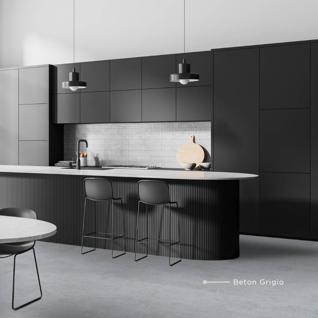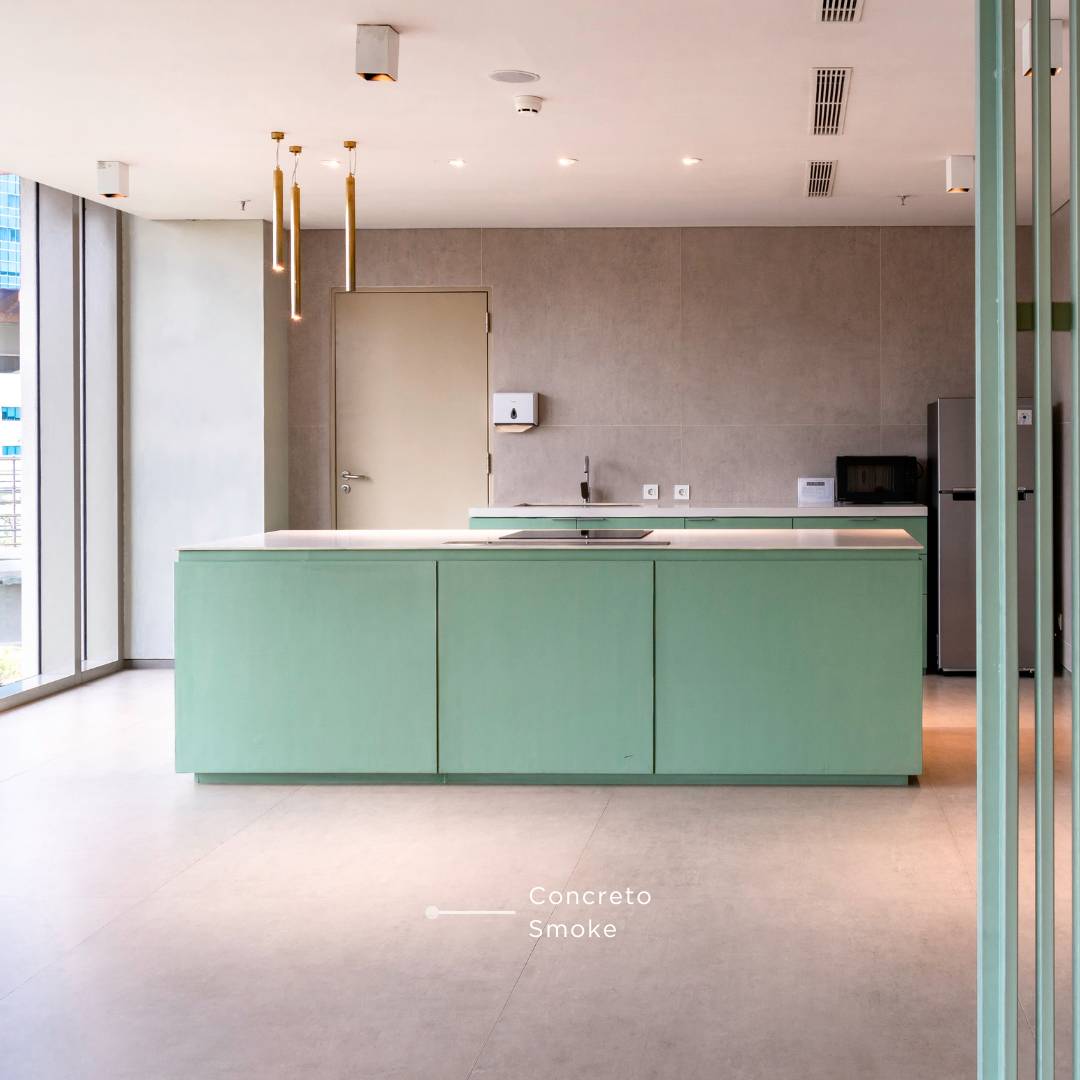 Motif concrete adalah elemen penting dalam desain dapur gaya industrial minimalis. Beton dapat digunakan untuk berbagai elemen dapur seperti lantai, top table, atau backsplash untuk memberikan kesan exposed wall yang khas. Menggunakan beton sebagai bahan utama akan menciptakan tampilan yang kokoh dan tahan lama. Untuk memberikan gaya industrial pada dapur rumah Anda, manfaatkan keindahan motif QUADRA Concreto Smoke yang terdapat pada motif Cement QUADRA.