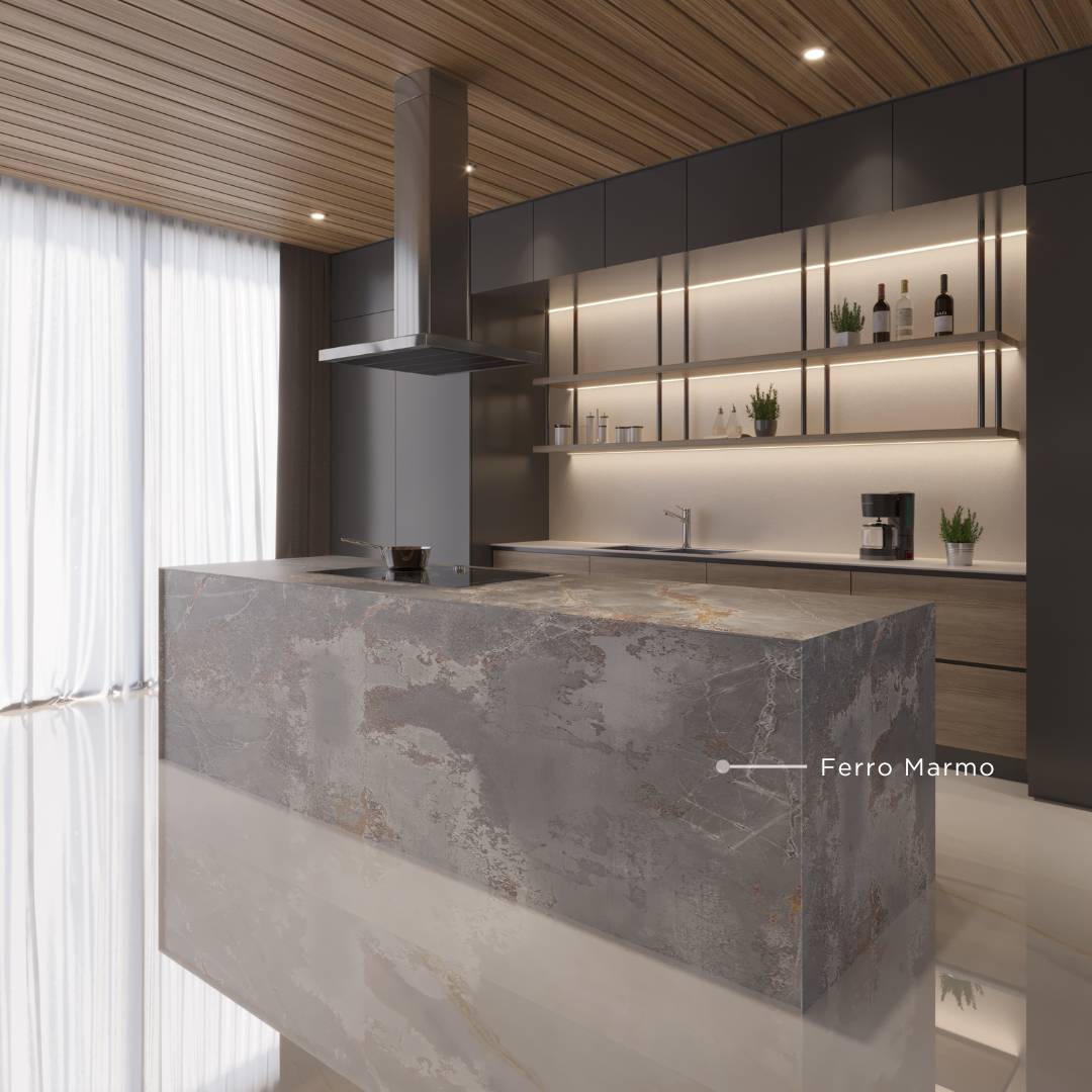 Anda juga bisa menggunakan QUADRA Ferro Marmo yang menawarkan pilihan material metal untuk menambah kesan industrial pada dapur rumah Anda. Dengan material metal, desain dapur gaya industrial minimalis Anda akan terlihat lebih modern dan memiliki karakter yang kuat, sesuai dengan konsep industrial minimalis. Selain itu, logam juga mudah dibersihkan dan memiliki umur panjang, sehingga praktis untuk dapur Anda.