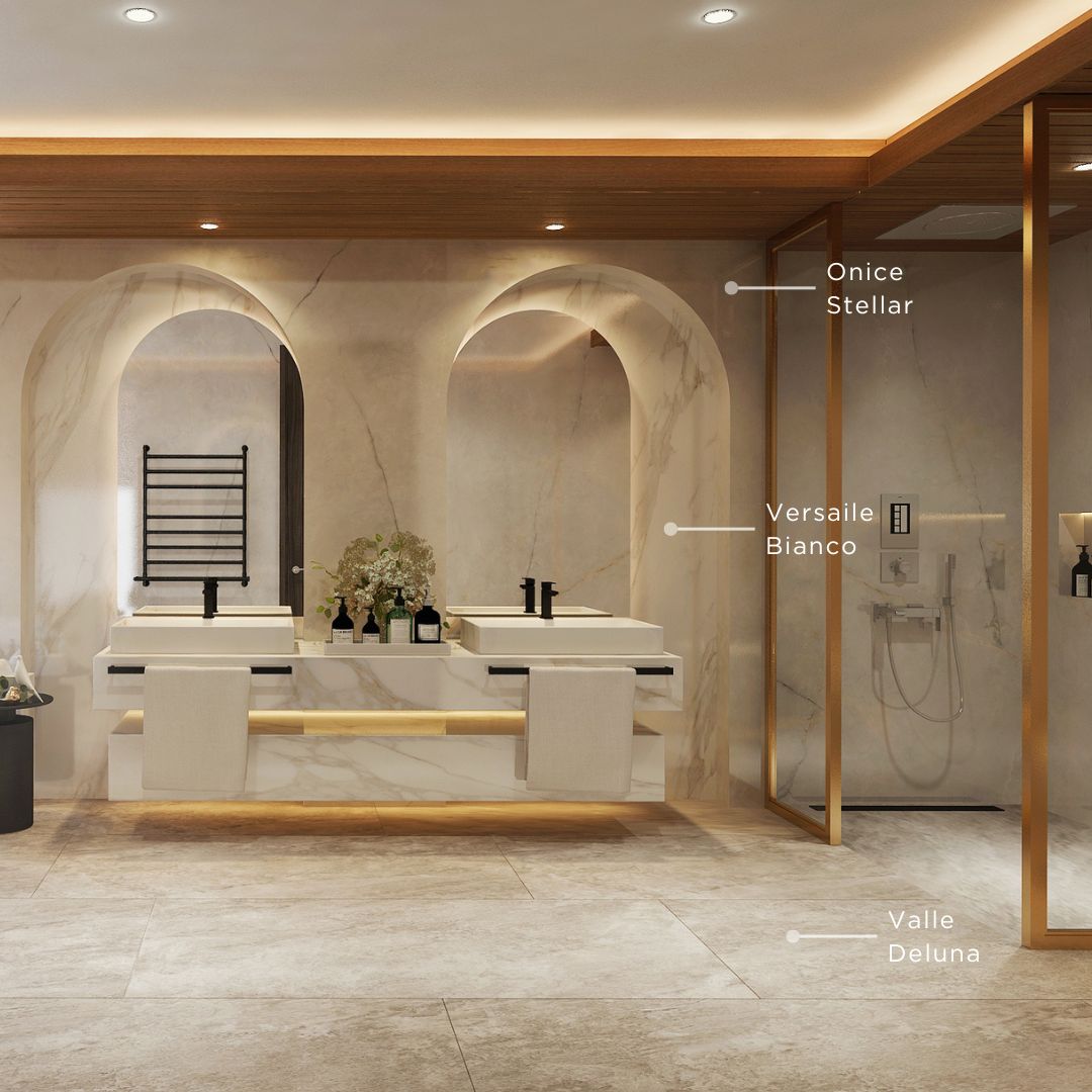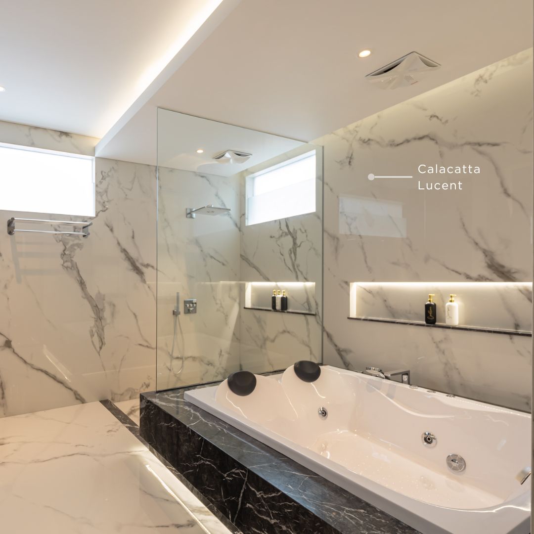 Ketahanan terhadap kelembaban ini membuat QUADRA sangat cocok untuk lingkungan kamar mandi yang selalu basah. Kekuatan material ini dalam menahan air pada area lantai dan dinding kamar mandi memberikan keuntungan bagi kamar mandi Anda sehingga tetap dalam kondisi prima selama bertahun-tahun. Anda juga dapat memanfaatkan motif menawan QUADRA Calacatta Lucent untuk desain kamar mandi yang mewah dan elegan.