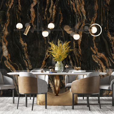 Terinspirasi dari tampilan batu leleh alami, Magma Scuro menghadirkan marmer hitam dengan nuansa keemasan yang eksotis. Cocok untuk menambahkan sentuhan hangat dan stylish pada ruang keluarga dengan high ceiling, ruang vip atau ruang komersial seperti restoran dan butik.
