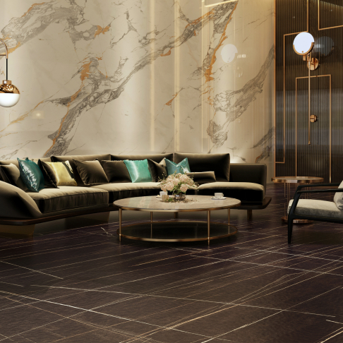 Motif Marquina Nero juga dapat menjadi pilihan ideal untuk area seperti backdrop TV atau foyer rumah kamu yang ingin menonjolkan aksen mewah tanpa terlihat berlebihan. Motif marmer hitam ini juga mudah dipadukan dengan furnitur berwarna netral maupun keemasan untuk mempercantik tampilan lantai marmer di rumah.