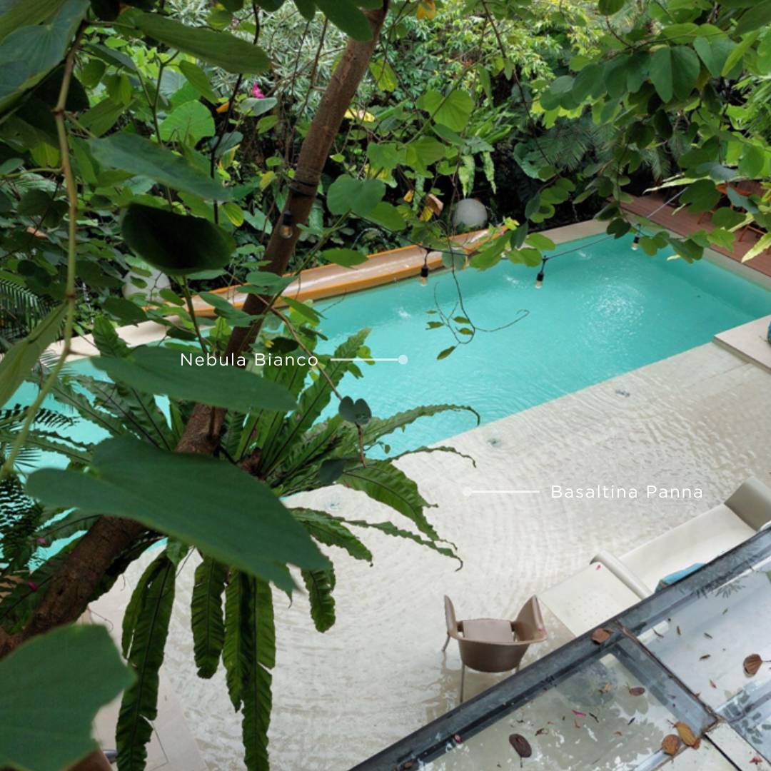 Warna putih membantu menonjolkan elemen-elemen di sekitar kolam dan menciptakan tampilan yang bersih dan terang. Warna ini sangat cocok untuk rumah Anda yang memiliki paparan sinar matahari tinggi. Anda dapat menggunakan QUADRA Basaltina Panna dan QUADRA Nebula Bianco sebagai pilihan lantai berwarna putih yang natural.