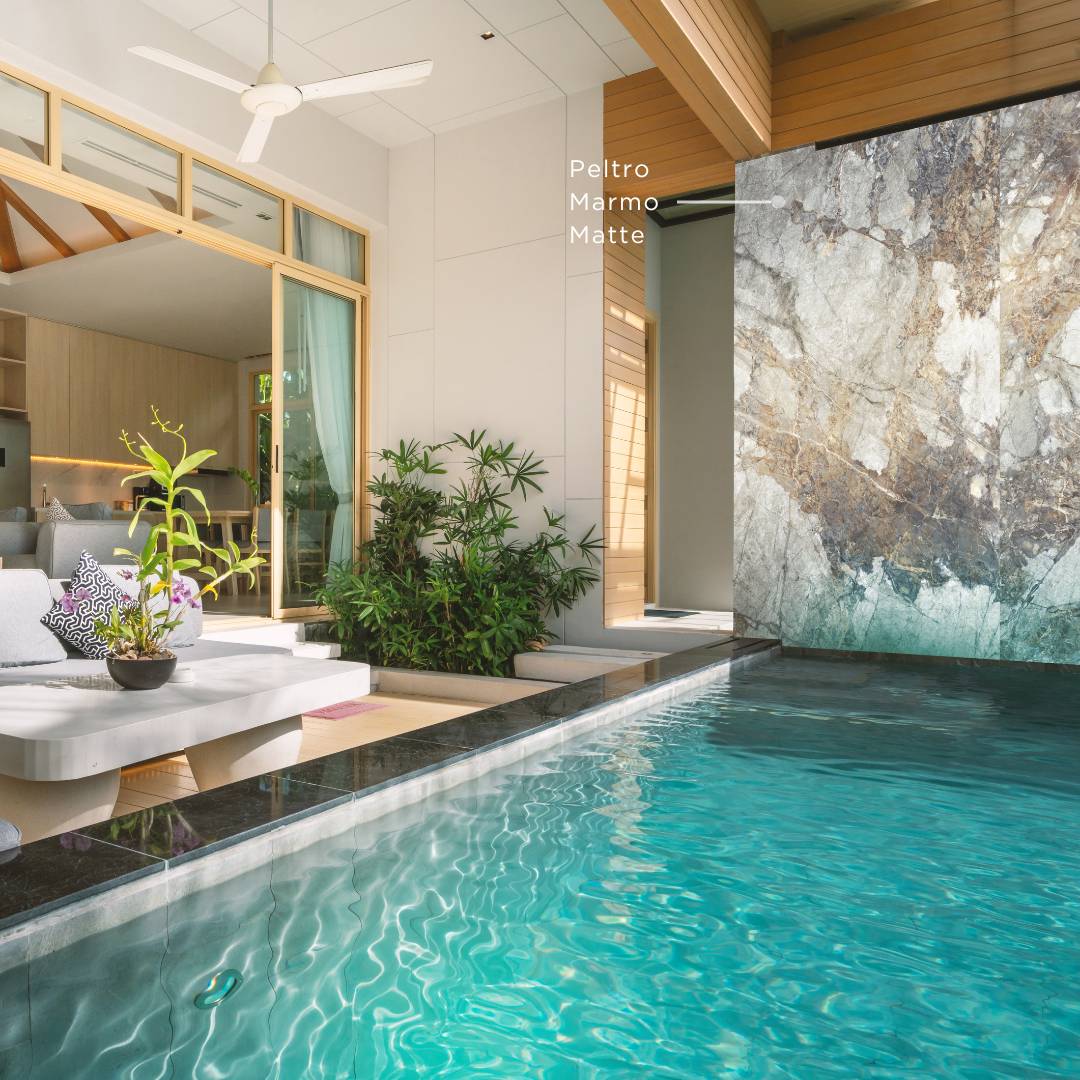 Sedangkan untuk kolam yang lebih dalam, warna biru akan semakin gelap. Ini memberikan efek visual yang dramatis dan cocok untuk kolam renang dewasa atau kolam utama. Apabila Anda ingin menambah kesan dramatis, Anda dapat menggunakan QUADRA Peltro Marmo sebagai backwall di area kolam renang Anda.