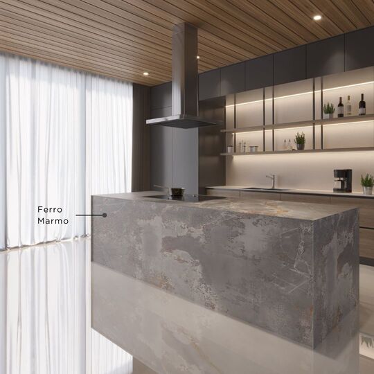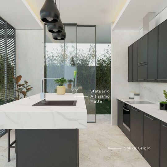 Untuk dapur semi-outdoor, memilih material interior yang tahan terhadap cuaca merupakan hal yang penting. Sintered stone Quadra adalah pilihan populer karena tahan karat, tahan air, tahan api, tahan noda, dan mudah dibersihkan. Selain itu, pilihlah peralatan memasak yang dirancang khusus untuk penggunaan luar ruangan, seperti grill dan oven pizza.