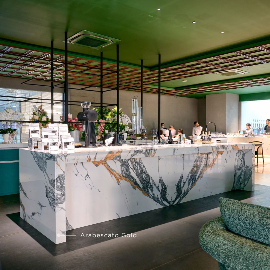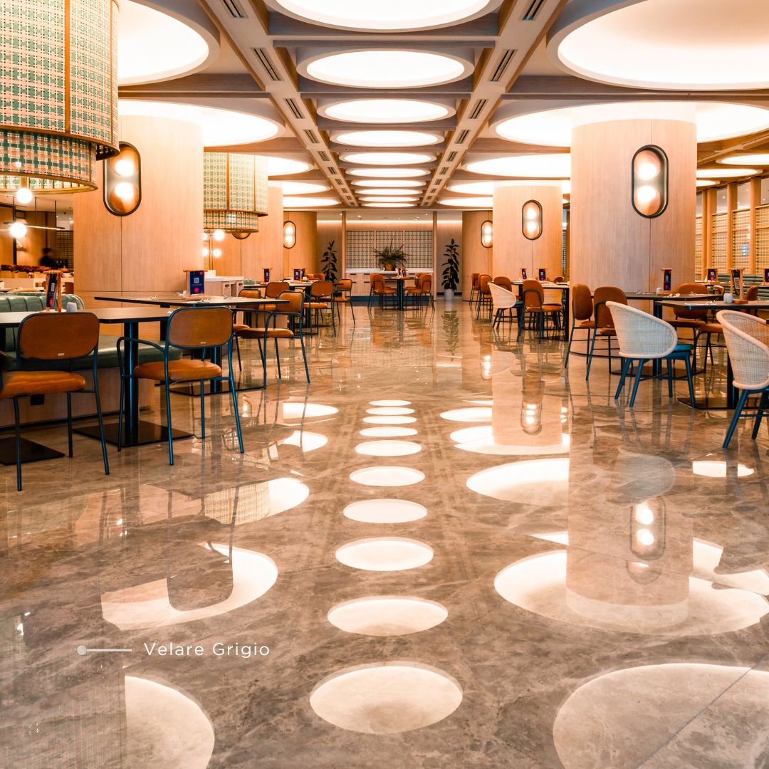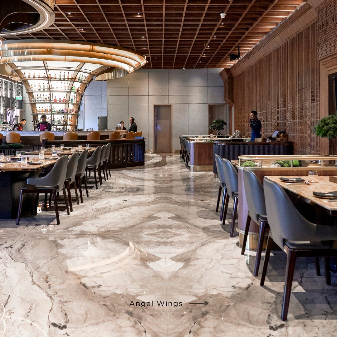 Desain plafon yang unik dapat memberikan karakter tersendiri pada sebuah restoran.Desain langit-langit yang ikonik dengan pola yang fleksibel dan pencahayaan yang mempertegas bentuk ceiling. Kombinasi pola ini memberikan kesan dinamis dan modern, menciptakan efek visual yang menarik. Material seperti sintered stone dari QUADRA dapat digunakan pada plafon untuk menambah dimensi dan kesan dramatis, sementara pencahayaan mempertegas detail interior restoran, menjadikannya salah satu fokus utama yang memukau.