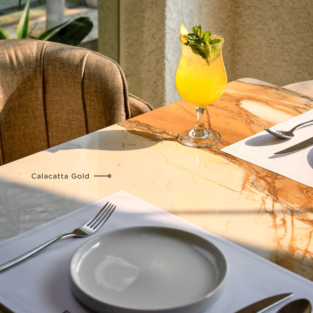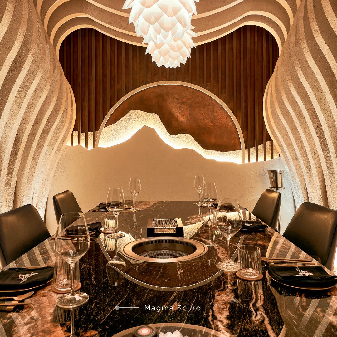 Pencahayaan memainkan peran penting dalam menciptakan suasana mewah di dalam restoran. Pencahayaan adalah elemen utama yang mendefinisikan atmosfer ruang. Restoran ini menggunakan perpaduan antara pencahayaan alami dan buatan untuk menciptakan suasana yang intim dan hangat. Penggunaan pendant lamp kaca menambah kesan kemewahan dengan bentuk plafon geometris klasik. Lampu LED tersembunyi menyoroti tekstur dinding dan furnitur dengan permukaan halus, membuat ruang terasa lebih hidup dan luas. Dengan material QUADRA, Anda bisa memperkuat efek pencahayaan ini, memanfaatkan material sintered stone yang indah untuk menciptakan nuansa hangat dan elegan yang lebih dalam, sehingga memperkaya keseluruhan desain interior restoran.