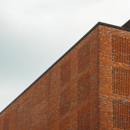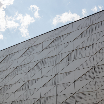 Material ini sangat populer dalam gaya industrial modern. Terbuat dari lembaran logam seperti aluminium atau baja yang dilubangi dengan pola tertentu, material fasad ini memberikan efek visual yang unik sekaligus memungkinkan sirkulasi udara. Cocok digunakan sebagai second skin fasad atau shading panel. Keunggulannya adalah ringan, tahan lama, dan mudah dibentuk.