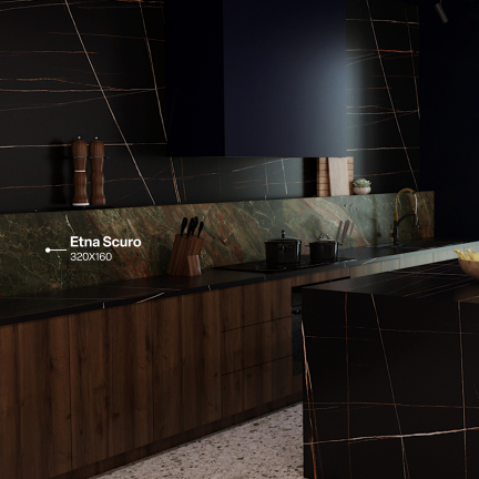 Terinspirasi dari Gunung Etna di Italia, QUADRA Etna Scuro hadir dalam nuansa cokelat gelap dengan urat kemerahan. Motifnya yang tegas namun elegan menjadikannya pilihan ideal untuk backsplash kitchen modern. Permukaannya memberikan visual yang memperkuat karakter ruang.